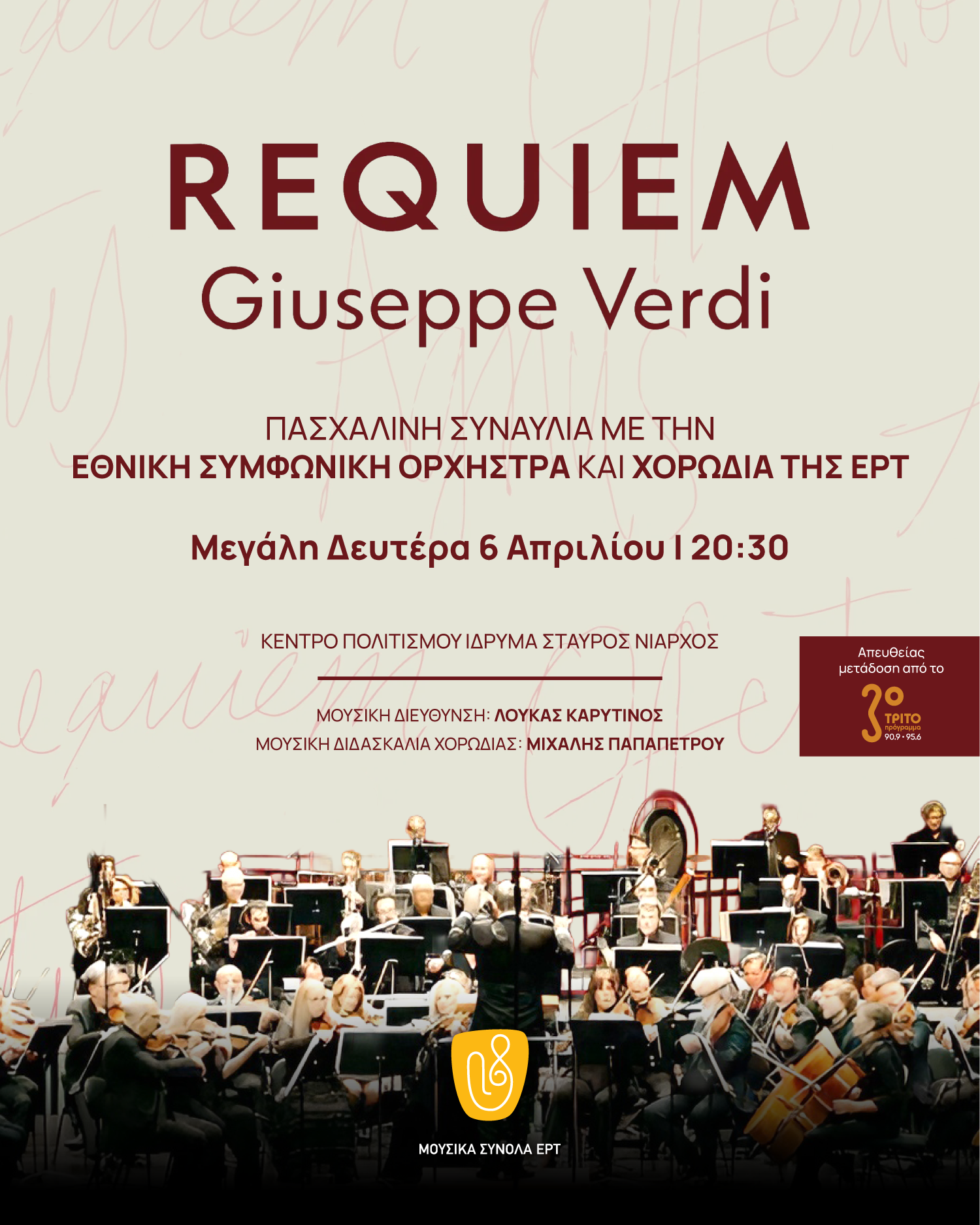 Η Εθνική Συμφωνική Ορχήστρα και η Χορωδία της ΕΡΤ, υπό τη διεύθυνση του Λουκά Καρυτινού και τη Διδασκαλία της Χορωδίας από τον Μιχάλη Παπαπέτρου, συμπράττουν με τέσσερις διεθνούς φήμης σολίστες και παρουσιάζουν τη Μεγάλη Δευτέρα, 6 Απριλίου, στις 20:30 στην αίθουσα Σταύρος Νιάρχος, το αριστουργηματικό Ρέκβιεμ του Τζουζέπε Βέρντι.