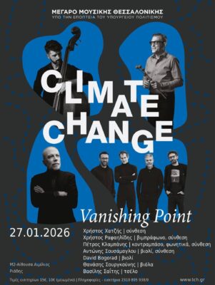 Η μουσική κολεκτίβα Climate Change παρουσιάζει στο Μέγαρο Μουσικής Θεσσαλονίκης το άλμπουμ Vanishing Point. Εκεί όπου η σύγχρονη κλασική μουσική συναντά την τζαζ, ο Χρήστος Χατζής, ο Χρήστος Ραφαηλίδης, ο Πέτρος Κλαμπάνης και ο Αντώνης Σουσάμογλου, διεθνώς αναγνωρισμένοι μουσικοί, ενώνουν τις συνθέσεις και τη δεξιοτεχνία τους σε ένα εγχείρημα με κοινή μουσική γλώσσα που υπερβαίνει τις ταξινομήσεις.