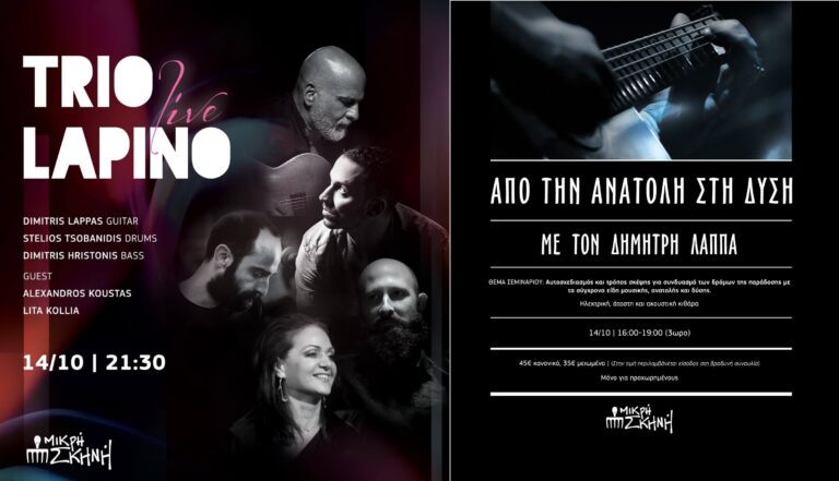 Την Πέμπτη 12 Οκτωβρίου στις 11:30 με καλεσμένο στο στούντιο τον μουσικό Δημήτρη Λάππα μιλήσαμε με αφορμή την εμφάνιση των Trio Lapino στη Μικρή Σκηνή (Θεσσαλονίκη) το Σάββατο 14/10. Το απόγευμα της ίδιας μέρας, στον ίδιο χώρο θα προηγηθεί σεμινάριο του Δημήτρη Λάππα “Από την Ανατολή στη Δύση”