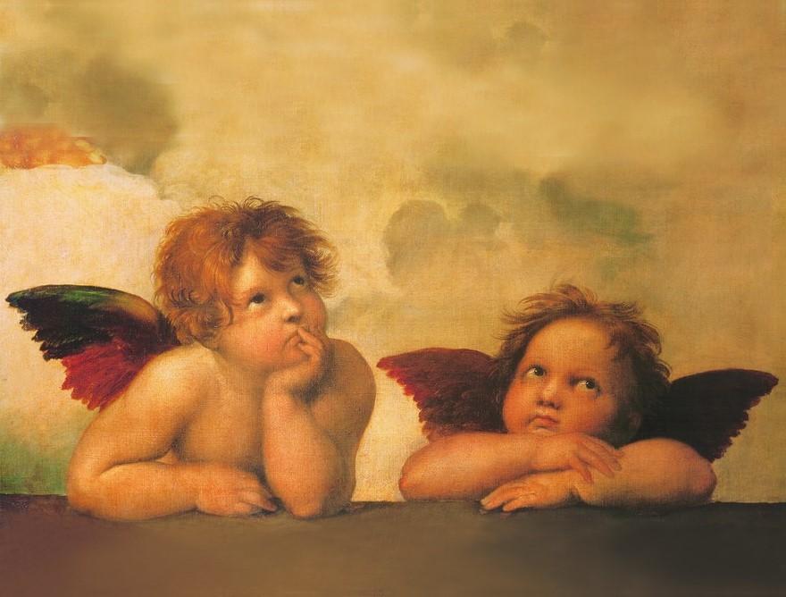 Και ο πίνακας: τα πιο διάσημα αγγελάκια στην ιστορία της Τέχνης με την υπογραφή του Ραφαήλ. «Κλέβουν» την παράσταση στον πίνακά του «Η Παναγία με το Θείο Βρέφος, τον Άγιο Σίξτο και την Αγία Βαρβάρα» γνωστότερο ως «Παναγία του Αγίου Σίξτου». Την ελαιογραφία παρήγγειλε ο Πάπας Ιούλιος ΙΙ για την εκκλησία του Αγίου Σίστου στην Πιατσέντζα της Ιταλίας. Θρυλείται ότι ο Ραφαήλ εμπνεύστηκε τα αγγελάκια από δυο παιδιά που είδε τυχαία να κοιτούν ψωμιά και γλυκά έξω από έναν φούρνο. Αποτελούν την παιχνιδιάρικη νότα στον πίνακα: κέρδισαν τις εντυπώσεις και μετατράπηκαν σε πανίσχυρη εικόνα τον 20ο αιώνα δρέποντας δάφνες στον χώρο του μάρκετινγκ.
