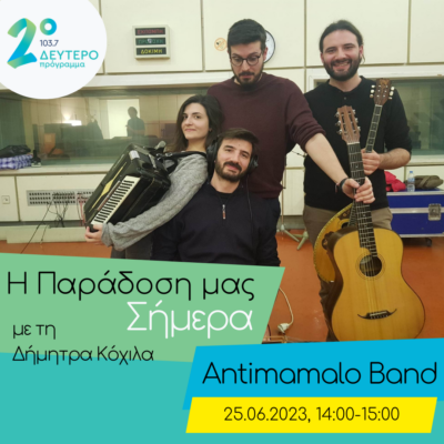 Αυτή την Κυριακή έρχονται στο «Δέντρο της Μουσικής», οι «AntimamaloBand», μουσική ομάδα ή και «οικογενειακή υπόθεση» καθώς συναντιούνται τρία αδέρφια και ένα αδερφικός φίλος, οι οποίοι έχοντας ως αφετηρία τα μουσικά βιώματα, τις σπουδές και την καλλιτεχνική αναζήτηση, προσεγγίζουν με το δικό τους τρόπο το ύφος των ορχηστρών της Σμύρνης και της Πόλης, το κλασικό ρεμπέτικο τραγούδι, την ελληνική παραδοσιακή μουσική, καθώς και νέες συνθέσεις των μελών του σχήματος.