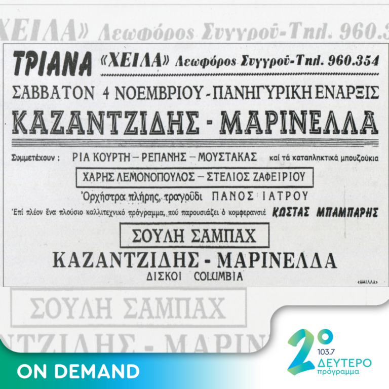ΣΗΜ: Η διαφημιστική καταχώρηση από την εποχή που αρχίζει να περιορίζεται η δύναμη του ζεϊμπέκικου στα λαϊκά κέντρα. Από την «Τριάνα του Χειλά»…