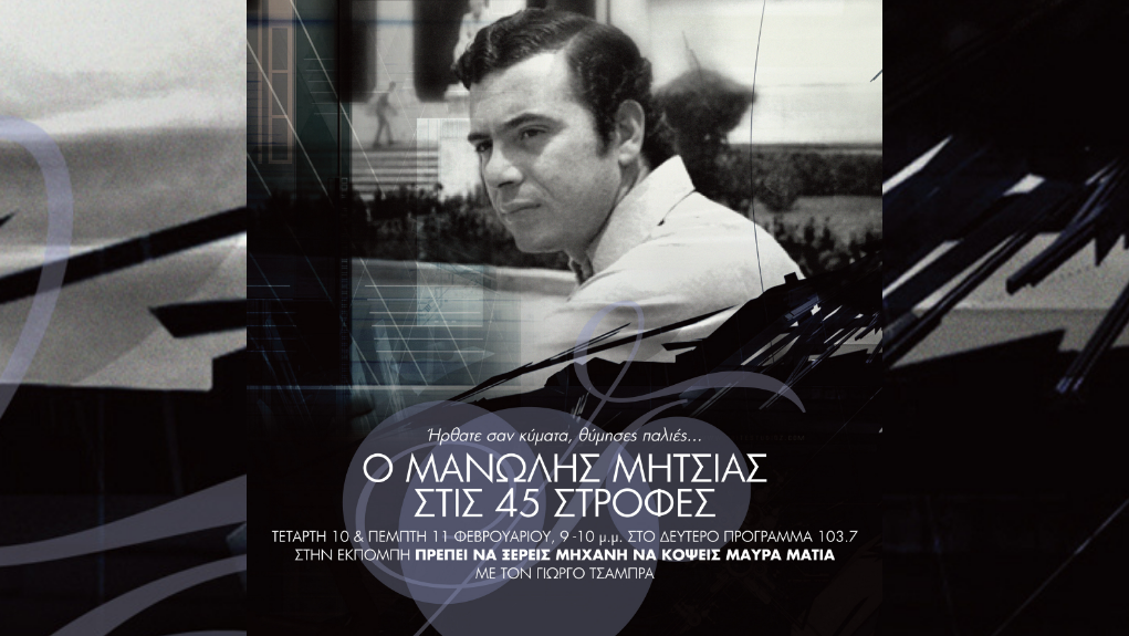 «Βάλε καμιά πλάκα με τον Μπιθικώτση» συμβούλευε ένα από τα πρώτα 45άρια που τραγούδησε ο Μανώλης Μητσιάς. Εμείς προτιμήσαμε έναν πιο νοσταλγικό στίχο : «Ήρθατε σαν κύματα, θύμισες παλιές…». Τετάρτη 10 Φεβρουαρίου, 9 με 10 το βράδυ, στο Δεύτερο Πρόγραμμα 103.7. Οι μικροί δίσκοι 45 στροφών, όταν ξεκινάει ο Μανώλης Μητσιάς λίγο πριν τα 1970, είναι ακόμη βασικός φορέας κυκλοφορίας των τραγουδιών. Ακόμη έχει θέση στις συνήθειες του κοινού, η δημόσια ακρόαση μέσω των τζουκ μποξ. Βέβαια, καθώς περνούν τα χρόνια, καθιερώνονται οι μεγάλοι δίσκοι βινυλίου – δίσκοι συνθετών ή προσωπικοί δίσκοι τραγουδιστών – και όλο και λιγότερα τραγούδια κυκλοφορούν σε 45άρια. Κι έρχεται μια εποχή που σε 45άρια κυκλοφορούν κυρίως κάποια σκόρπια «εποχιακά» τραγούδια που σιγά σιγά ξεχνιούνται. Η αλήθεια είναι ότι ο Μητσιάς είναι από τους τραγουδιστές με το πιο ανθεκτικό ρεπερτόριο στο χρόνο. Τα τραγούδια του Δήμου Μούτση, του Λουκιανού Κηλαηδόνη, του Μάνου Χατζιδάκι, του Γιάννη Σπανού, του Γιώργου Χατζηνάσιου με στίχους Νίκου Γκάτσου, Λευτέρη Παπαδόπουλου, Γιάννη Λογοθέτη, Γιώργου Κανελλόπουλου, είτε σε μεγάλους δίσκους, είτε σε 45άρια, αντέχουν όλα αυτά τα χρόνια. Αλλά και κάποια ακόμη, δημιουργών που έχουν συνδεθεί λιγότερο μαζί του στη μνήμη μας, ακούγονται εν ονόματι της εποχής τους. Τραγούδια της Ελένης Καραΐνδρου, του Αντώνη Κατινάρη, του Ανδρέα Πρέζα – που μαζί του ξεκίνησε στην δισκογραφία – ή ακόμη και του Βασίλη Τσιτσάνη, πού τότε ηχογραφεί μαζί του σε δεύτερη εκτέλεση κάποια τραγούδια από το δικό του «ξεκίνημα». Στις δύο εκπομπές, παρακολουθούμε όσο μπορούμε αυτή τη «διαδρομή» των πρώτων χρόνων του Μανώλη Μητσιά, μέσα από την φωτεινή αλλά και πίσω από την «άλλη» όψη των 45αριών του ’70. Πάντα με την πεποίθηση και με στόχο ότι «Πρέπει να ξέρεις μηχανή να κόψεις μαύρα μάτια».