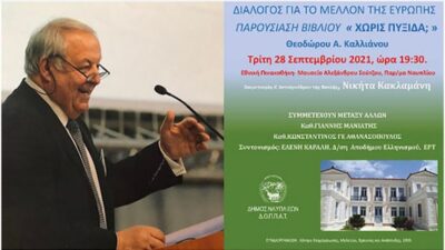 Το βιβλὶο «Χωρίς πυξίδα; 30+ βήματα για την Ευρώπη» του Οικονομολόγου Θεοδώρου Καλλιάνου, Επισκέπτη Καθηγητού στο Πανεπιστήμιο της Βόννης, παρουσιάζεται σήμερα, Τρίτη, 28 Σεπτεμβρίου και ώρα 19.30, σε ανοικτή εκδήλωση διαλόγου, στον χώρο και με την υποστήριξη της Εθνικής Πινακοθήκης-Μουσείο Αλεξάνδρου Σούτσου στο Ναύπλιο.