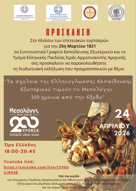 Μια εκπομπή αφιερωμένη στην ελληνόγλωσση εκπαίδευση στο εξωτερικό. Φιλοξενούμενος ήταν ο Αναπληρωτής Συντονιστής Εκπαίδευσης στο Γενικό Προξενείο της Ελλάδας στο Γιοχάνεσμπουργκ κ. Γεώργιος Βλάχος. Αφορμή για αυτή τη συνομιλία ήταν η διαδικτυακή εκδήλωση «Τα σχολεία της Ελληνόγλωσσης Εκπαίδευσης τιμούν το Μεσολόγγι – 200 χρόνια από την Έξοδο» που διοργανώνουν τα Συντονιστικά Γραφεία Εκπαίδευσης Εξωτερικού, σε συνεργασία με το Τμήμα Ελληνικής Παιδείας της Ιεράς Αρχιεπισκοπής Αμερικής στις 24 Απριλίου. Την εκδήλωση μπορεί να παρακολουθήσει “ζωντανά” όποιος ενδιαφέρεται στον σύνδεσμο που ακολουθεί: https://www.youtube.com/live/tY96QtrHH48