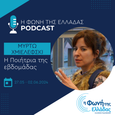 Η ΦΩΝΗ ΤΗΣ ΕΛΛΑΔΑΣ, το ραδιόφωνο της ΕΡΤ που απευθύνεται στους Έλληνες όπου γης, με όχημα τη διάδοση, τη στήριξη, και την προβολή της ελληνικής γλώσσας και του ελληνικού πολιτισμού, εντάσσει και πάλι στο πρόγραμμά της τα αφιερωματικά δίλεπτα ποίησης με τίτλο «Ο ποιητής της εβδομάδας» και «Η ποιήτρια της εβδομάδας». Κάθε εβδομάδα είναι αφιερωμένη σ’ έναν σύγχρονο Έλληνα ποιητή ή ποιήτρια, ενώ δεν απουσιάζουν οι ποιητές της Διασποράς. Οι ίδιοι οι ποιητές και οι ποιήτριες επιμελούνται τις ραδιοφωνικές ερμηνείες. Παράλληλα τα ποιήματα «ντύνονται» με πρωτότυπη μουσική, που συνθέτουν και παίζουν στο στούντιο της Ελληνικής Ραδιοφωνίας οι μουσικοί της Ορχήστρας της ΕΡΤ, καθώς και με μουσικά κομμάτια αγαπημένων δημιουργών. Επτά ποιήματα κάθε εβδομάδα, ένα ελληνικό ποίημα κάθε ημέρα, ταξιδεύει μέσα από τις συχνότητες της ΦΩΝΗΣ ΤΗΣ ΕΛΛΑΔΑΣ, στα πέρατα της γης, όπου υπάρχουν ελληνικές φωνές. Η εβδομάδα από 27/05/2024 έως 2/06/2024 είναι αφιερωμένη στην ποιήτρια Μυρτώ Χμιελέφσκι. Μουσική επιμέλεια: Μαρία Ρεμπούτσικα Επιμέλεια ήχου: Ελευθερία Παπουτσάκη – Γιώργος Γιαννακούλας Μετάδοση: Δευτέρα ως Παρασκευή στις 07:00 και 19:00 ώρα Ελλάδας και το Σ/Κ στις 19:00 ώρα Ελλάδας.