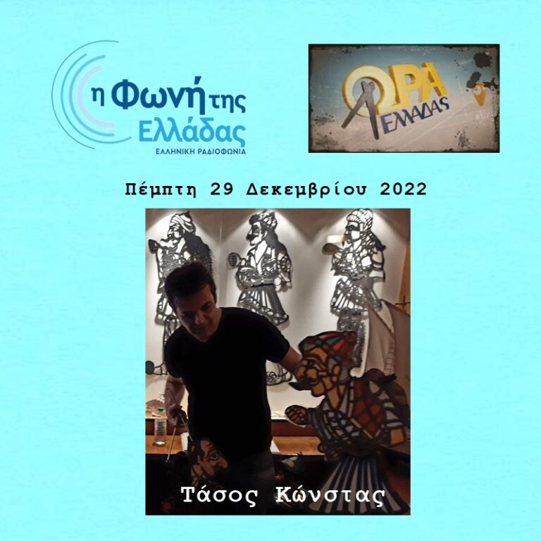 Ο Καραγκιόζης ανεβαίνει στο Ραδιομέγαρο και στήνει τον μπερντέ του… Μια ξεχωριστή ΩΡΑ ΕΛΛΑΔΑΣ με καλεσμένο τον έμπειρο Καραγκιοζοπαίκτη Τάσο Κώνστα και φιλοξενούμενη την κόρη του Μαρίσα! Ο Νικόλας Αγγελίδης μιλάει με τον μεγάλο πρωταγωνιστή που μεγαλώνει γενιές και γενιές πίσω από το μαγικό πανί του με τους λαϊκούς ήρωες των παιδιών μικρών και μεγάλων να αγκαλιάζουν κάθε ευαίσθητη χορδή της ψυχής. Από τον θρυλικό Γιώργο Μπλατσάρα (Μπαρμπαγιώργος) στον Σιόρ Διονύσιο, το Κολλητήρι, την Αγλαΐα, την όμορφη Βεζυροπούλα, τον Σταύρακα τον μάγκα, τον Μορφωνιό, τον Χατζηαβάτη που εισπράττει καρπαζιές, μέχρι τον Βαληγκέκα το πρωτοπαλίκαρο του Σαραγιού… Απολαύστε τους…