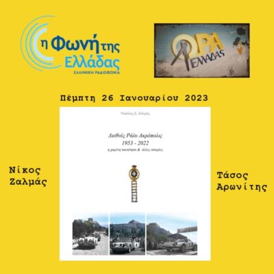 Ταξιδεύουμε στο χρόνο και συναντάμε απίθανες ιστορίες από το μαγικό κόσμο του αυτοκινήτου. Στο στούντιο της “Φωνής της Ελλάδας” ο συγγραφέας του βιβλίου “Διεθνές Ράλι Ακρόπολις 1953-2022”, Νίκος Ζαλμάς και ο φίλος της αυτοκίνησης, κινηματογραφιστής Τάσος Αρωνίτης. Μαθαίνουμε ιστορίες από το ένδοξο παρελθόν. Στο μικρόφωνο της εκπομπής ΩΡΑ ΕΛΛΑΔΑΣ ο Νικόλας Αγγελίδης