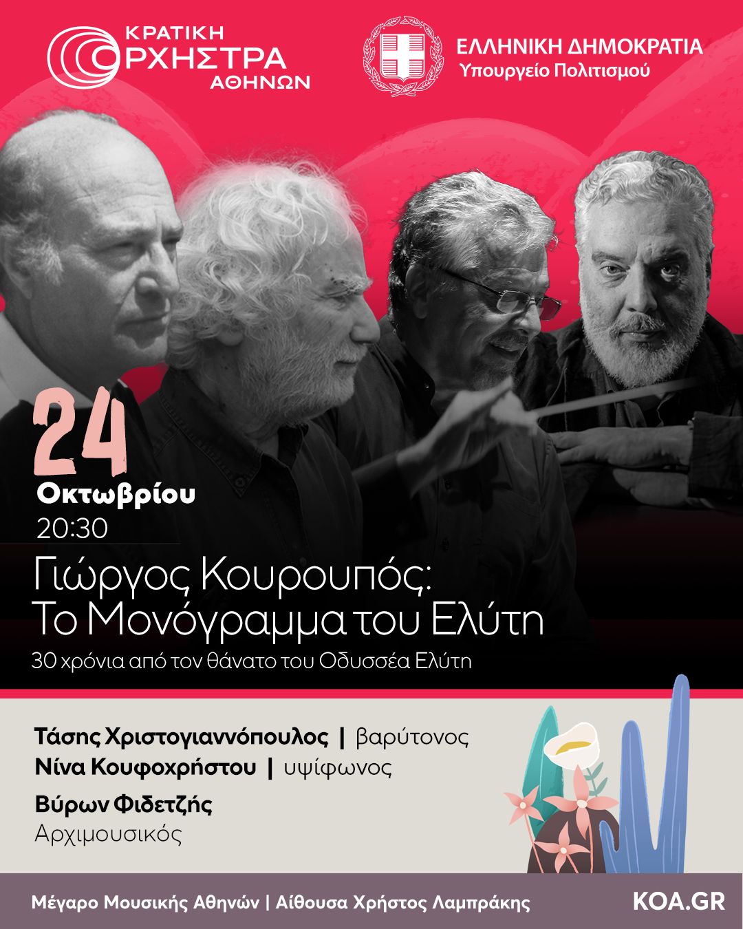 Αφιερωμένη στην σκηνική καντάτα του Γιώργου Κουρουπού «Μονόγραμμα» για σολίστες μικτή χορωδία και συμφωνική ορχήστρα πάνω στην ερωτική ποίηση του Οδυσσέα Ελύτη είναι αφιερωμένη η σημερινή εκπομπή με αφορμή το ότι το σημαντικό αυτό όσο και εμβληματικό έργο παρουσιάζεται με κορυφαίους συντελεστές από την Κρατική Ορχήστρα Αθηνών στις 24 του μήνα στο Μέγαρο Μουσικής Αθηνών.