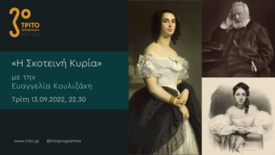 Η ΣΚΟΤΕΙΝΗ ΚΥΡΙΑ, με οδηγό την πένα της Φρανσουάζ Ξενάκη, συναντά την Adèle Foucher, τη σύζυγο του συγγραφέα Victor Hugo: παιδικός και εφηβικός έρωτας του Hugo, η Adèle, μια μάλλον συνηθισμένη κοπέλα, με στέρεο και πρακτικό χαρακτήρα, βρέθηκε στο επίκεντρο του φαντασιακού ενός συγγραφέα που γνώριζε από την αρχή πως το έργο του ήταν σημαντικό και πως ο ίδιος θα γινόταν σπουδαίος. Ο έρωτάς του και η εμμονή του σε μια εξιδανικευμένη εκδοχή του εαυτού της τη θάμπωσαν, μα τελικά αποδείχθηκαν δυσβάσταχτο φορτίο για τους εύθραυστους ώμους της – όσο δυσβάσταχτος αποδείχθηκε ο γάμος της με τον Hugo για τον αδελφό του, που ήταν επίσης ερωτευμένος με την Adèle και πληγώθηκε ανεπανόρθωτα. Η Ξενάκη αναπλάθει μυθιστορηματικά θραύσματα της ζωής της Adèle, φωτίζοντας και την απρόσμενη συμμαχία της με τη Juliette Drouet, την ηθοποιό που εγκατέλειψε την καριέρα της για να αφοσιωθεί στον Hugo, έγινε η «επίσημη» ερωμένη του και αναβαθμίστηκε σταδιακά, από πέτρα του σκανδάλου σε ισότιμο μέλος ενός ménage à trois – το οποίο και εξελίχθηκε, ενάντια σε κάθε πρόβλεψη, σε καθεστώς διευρυμένης οικογένειας. Πλαισιώνουμε με César Franck, Jules Massenet και ποιήματα του Hugo σε μουσική Georges Bizet και Gabriel Fauré.