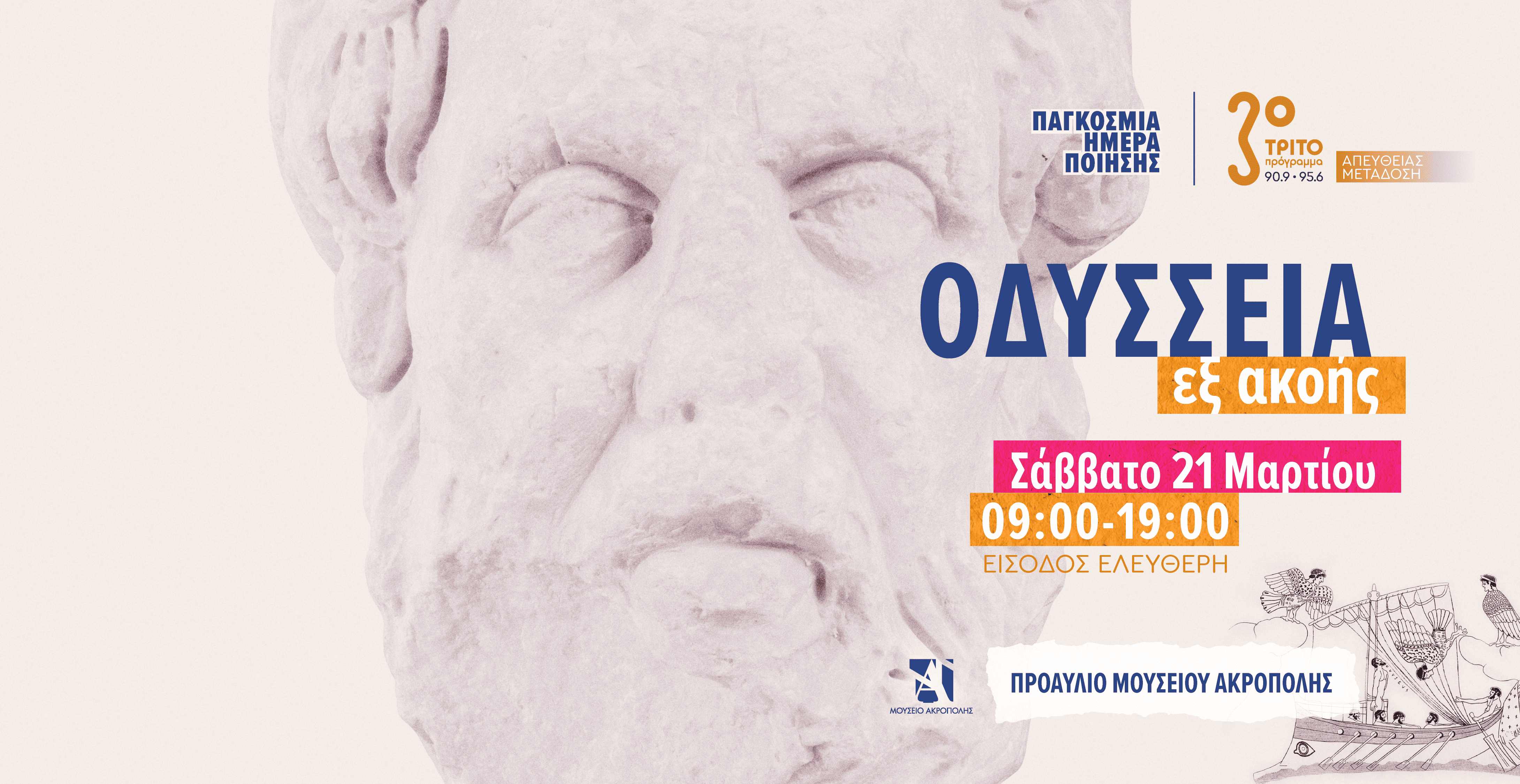 Με την ευκαιρία της Παγκόσμιας Ημέρας Ποίησης το Μουσείο Ακρόπολης και το Τρίτο Πρόγραμμα της Ελληνικής Ραδιοφωνίας προσκαλούν τους επισκέπτες και τους ακροατές τους, το Σάββατο 21 Μαρτίου, από τις 09:00 έως τις 19:00,στη μαραθώνια συνακρόαση «Οδύσσεια εξ ακοής». Έπειτα από την θερμή υποδοχή της περυσινής ανάγνωσης της Ιλιάδας, η συνεργασία των δύο φορέων επιστρέφει στο Ομηρικό σύμπαν, ακολουθώντας τα ίχνη του Οδυσσέα.