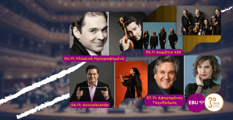 Τα Μουσικά Ταξίδια σε Μοναδικές Συναυλίες μέσω της EBU μεταφέρουν και φέτος τους ακροατές του Τρίτου σε σπουδαίες μουσικές παραστάσεις, Τρίτη με Παρασκευή, κάθε βράδυ στις οκτώ και δέκα για δύο περίπου ώρες. Γι αυτήν την εβδομάδα ΣΥΝΑΥΛΙΕΣ ΔΙΧΩΣ ΣΥΝΟΡΑ την Τρίτη 04.11.25 την Τετάρτη 05.11.25 την Πέμπτη 06.11.25 και την Παρασκευή 07.11.25.