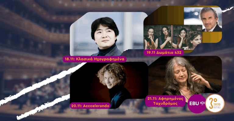 Τα Μουσικά Ταξίδια σε Μοναδικές Συναυλίες μέσω της EBU μεταφέρουν και φέτος τους ακροατές του Τρίτου σε σπουδαίες μουσικές παραστάσεις, Τρίτη με Παρασκευή, κάθε βράδυ στις οκτώ και δέκα για δύο περίπου ώρες. Γι αυτήν την εβδομάδα ΣΥΝΑΥΛΙΕΣ ΔΙΧΩΣ ΣΥΝΟΡΑ την Τρίτη 18.11.25 την Τετάρτη 19.11.25 την Πέμπτη 20.11.25 και την Παρασκευή 21.11.25.